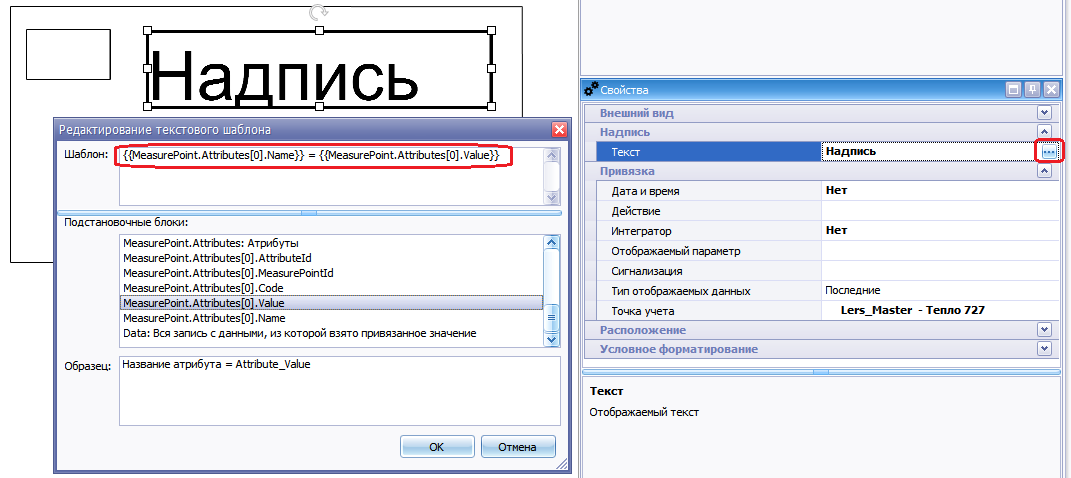 - Для отображения текущего значения атрибута можно использовать графический элемент Текст, для которого привязать точку учета и задать шаблон для надписи, используя подстановочные блоки.
