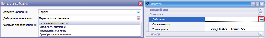 Для этого графическим элементам мнемосхемы (кроме Объект учёта и Кнопка) можно назначить действие, которое инициируется оператором и будет изменять значение атрибута точки учета связанной с элементом. Значение атрибута можно использовать в настройках условного форматирования элемента мнемосхемы.