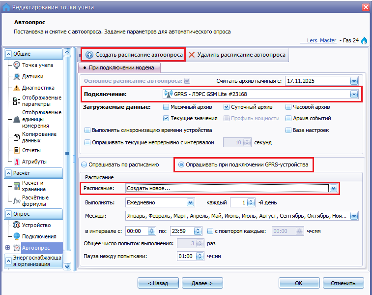 - В открывшемся окне в строке Подключение: выбрать требуемое GPRS-подключение, отметить Опрашивать при подключении GPRS-устройства и в строке Расписание выбрать Создать новое....