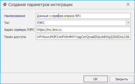 Выберите пункт меню "Справочники → Интеграции" и нажмите кнопку "Создать". Выберите тип интеграции ЛЭРС, введите наименование, адрес сервера источника и токен доступа полученный от учётной записи.