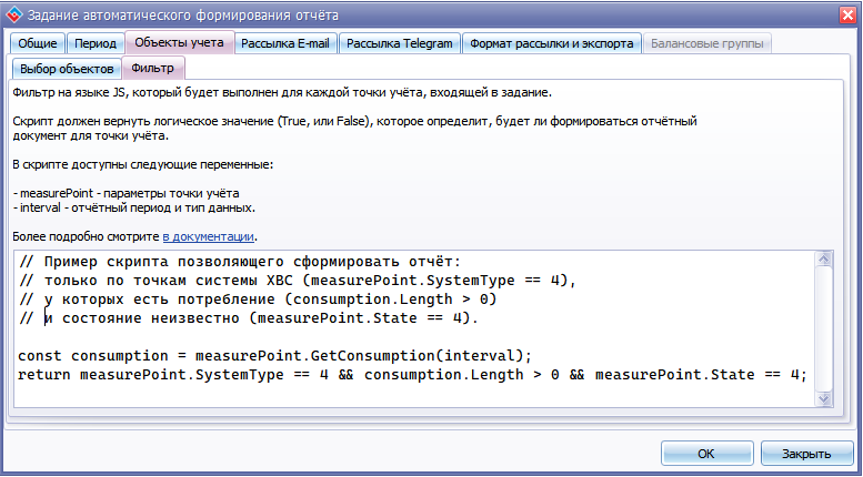 При автоматическом формировании отчётов точки учёта выбираются на основе заданных объектов учёта и систем снабжения. При необходимости можно дополнительно отфильтровать выбранные точки учёта с помощью пользовательского скрипта.